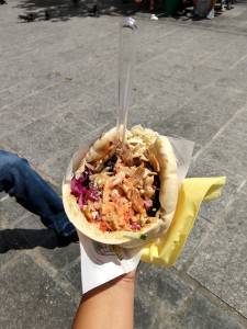 So, I’m a huge fan gyros and such, but fallafel has never really got me. That all changed when we went to L’As du Fallafel on Rue de Rosier. This place is no joke. I wish I’d taken more photos of the line and the whole operation, but I was too busy taking it all in. Eating here is a bit of a process, but well worth it. First, you find the guys by the door who look like club bouncers. You let them know if you’re going to eat in or take away. Take-away is faster, but finding a place to actually sit and eat is a bit challenging. If you’re doing take-away, the bouncer will take your order. Be sure to order EVERYTHING you want then – drinks, extras, etc. They take down your order hand you a slip after you pay. Then it’s queue time. The line is generally ALWAYS long, but it moved fast thanks to the skilled hands of the food prep team. When you get to the food window, hand over your slip and pay attention – they will ask you what you want on your sandwich. That’s it – once you get your fallafel or gyro, there is a park near by that you can sit and eat at. The picture below is of the chicken shwarma – we at the fallafel so fast I forgot to take a picture. The fallafel was AMAZING, crispy little nuggets of heaven. I’m totally a convert now.